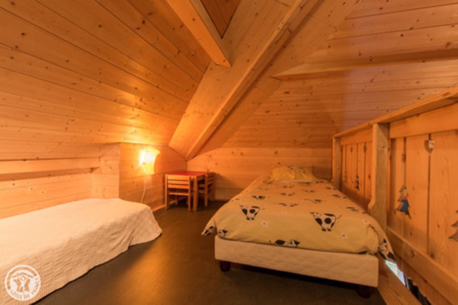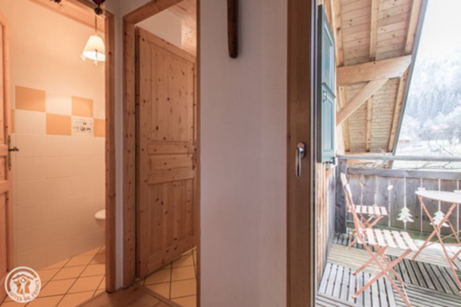 Chambre avec mezzanine. Vue montagnes, 1er étage, balcon. Parquet au sol. 1 lit 140x190cm, chevets + lampes, armoire penderie, bureau. Salle d'eau avec douche, wc indépendant. Sur mezzanine, 1 lit 1 personne + 1 lit d'appoint.